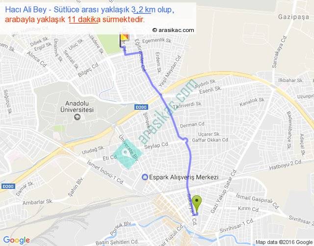 Hacı Ali Bey - Sütlüce arası yaklaşık olarak 90 km/h ile yukarıda belirtilen sürede olup, iki yerin kuş uçuşu uzaklığı (mesafesi) 3'dir. Yolculuk otobüsle 14 dakika sürmektedir.