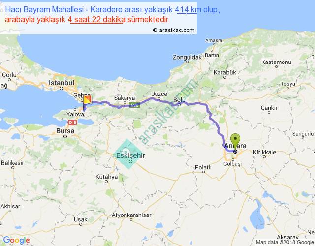 Hacı Bayram Mahallesi - Karadere arası yaklaşık olarak 90 km/h ile yukarıda belirtilen sürede olup, iki yerin kuş uçuşu uzaklığı (mesafesi) 295'dir. Eğer belirtilen yerler arasında uçak seferi var ise bu süre uçakla 27 dakika'ya kadar düşebilir. Yolculuk otobüsle 5 saat 40 dakika sürmektedir.