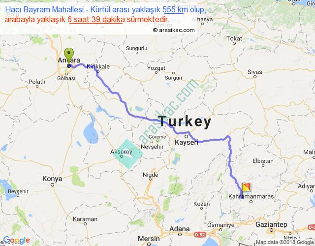 Hacı Bayram Mahallesi - Kürtül arası yaklaşık olarak 90 km/h ile yukarıda belirtilen sürede olup, iki yerin kuş uçuşu uzaklığı (mesafesi) 421'dir. Eğer belirtilen yerler arasında uçak seferi var ise bu süre uçakla 38 dakika'ya kadar düşebilir. Yolculuk otobüsle 8 saat 38 dakika sürmektedir.