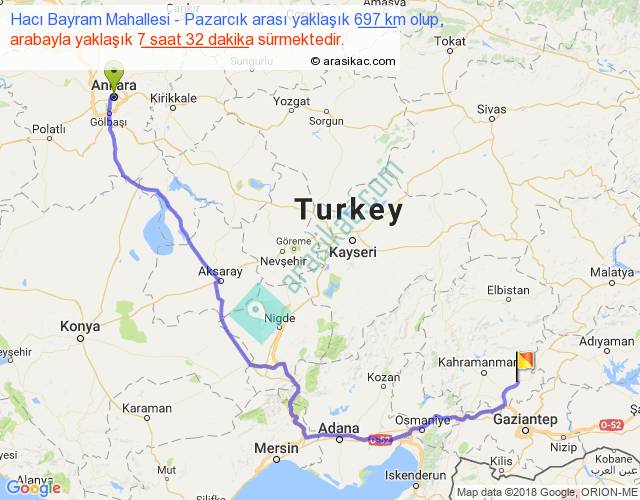 Hacı Bayram Mahallesi - Pazarcık arası yaklaşık olarak 90 km/h ile yukarıda belirtilen sürede olup, iki yerin kuş uçuşu uzaklığı (mesafesi) 469'dir. Eğer belirtilen yerler arasında uçak seferi var ise bu süre uçakla 43 dakika'ya kadar düşebilir. Yolculuk otobüsle 9 saat 47 dakika sürmektedir.