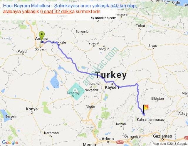 Hacı Bayram Mahallesi - Şahinkayası arası yaklaşık olarak 90 km/h ile yukarıda belirtilen sürede olup, iki yerin kuş uçuşu uzaklığı (mesafesi) 403'dir. Eğer belirtilen yerler arasında uçak seferi var ise bu süre uçakla 37 dakika'ya kadar düşebilir. Yolculuk otobüsle 8 saat 29 dakika sürmektedir.