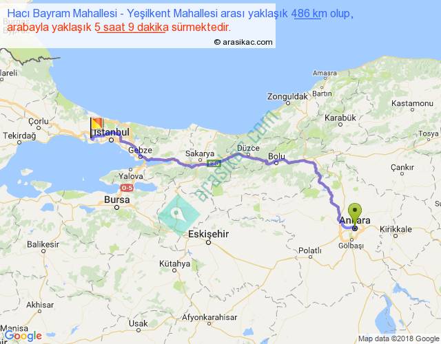 Hacı Bayram Mahallesi - Yeşilkent Mahallesi arası yaklaşık olarak 90 km/h ile yukarıda belirtilen sürede olup, iki yerin kuş uçuşu uzaklığı (mesafesi) 373'dir. Eğer belirtilen yerler arasında uçak seferi var ise bu süre uçakla 34 dakika'ya kadar düşebilir. Yolculuk otobüsle 6 saat 41 dakika sürmektedir.