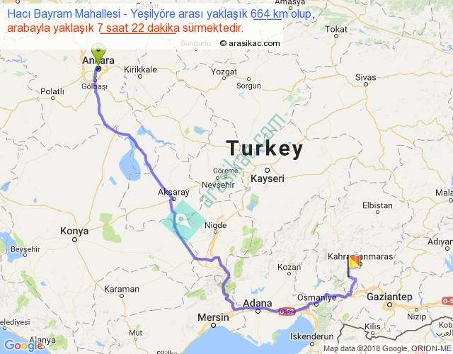 Hacı Bayram Mahallesi - Yeşilyöre arası yaklaşık olarak 90 km/h ile yukarıda belirtilen sürede olup, iki yerin kuş uçuşu uzaklığı (mesafesi) 437'dir. Eğer belirtilen yerler arasında uçak seferi var ise bu süre uçakla 40 dakika'ya kadar düşebilir. Yolculuk otobüsle 9 saat 34 dakika sürmektedir.