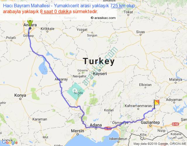 Hacı Bayram Mahallesi - Yumaklıcerit arası yaklaşık olarak 90 km/h ile yukarıda belirtilen sürede olup, iki yerin kuş uçuşu uzaklığı (mesafesi) 481'dir. Eğer belirtilen yerler arasında uçak seferi var ise bu süre uçakla 44 dakika'ya kadar düşebilir. Yolculuk otobüsle 10 saat 24 dakika sürmektedir.