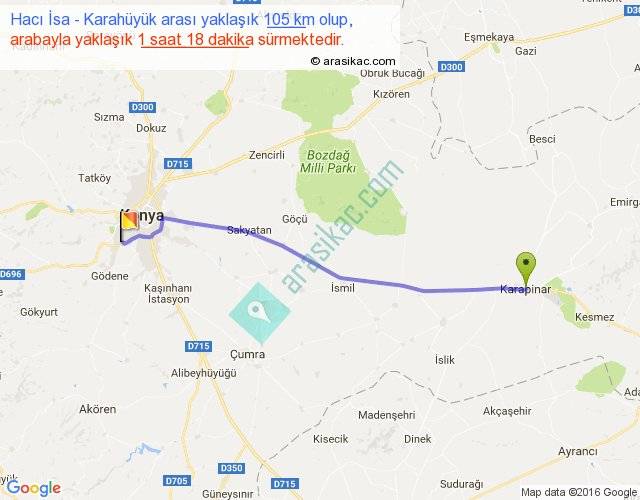 Hacı İsa - Karahüyük arası yaklaşık olarak 90 km/h ile yukarıda belirtilen sürede olup, iki yerin kuş uçuşu uzaklığı (mesafesi) 98'dir. Yolculuk otobüsle 1 saat 41 dakika sürmektedir.