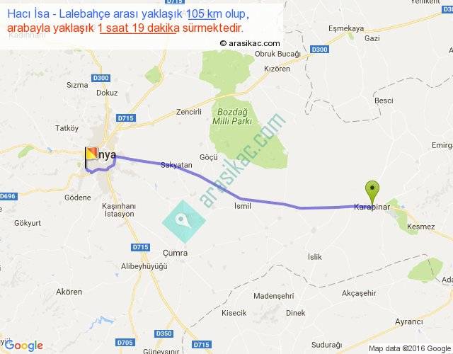Hacı İsa - Lalebahçe arası yaklaşık olarak 90 km/h ile yukarıda belirtilen sürede olup, iki yerin kuş uçuşu uzaklığı (mesafesi) 98'dir. Yolculuk otobüsle 1 saat 42 dakika sürmektedir.