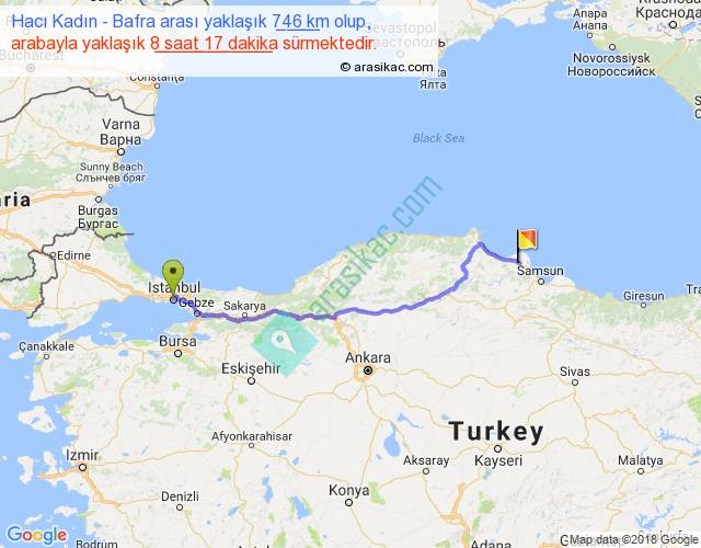 Hacı Kadın - Bafra arası yaklaşık olarak 90 km/h ile yukarıda belirtilen sürede olup, iki yerin kuş uçuşu uzaklığı (mesafesi) 580'dir. Eğer belirtilen yerler arasında uçak seferi var ise bu süre uçakla 53 dakika'ya kadar düşebilir. Yolculuk otobüsle 10 saat 46 dakika sürmektedir.