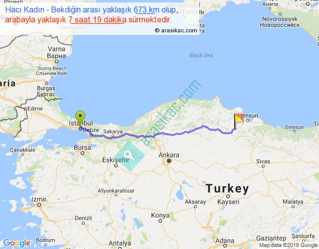 Hacı Kadın - Bekdiğin arası yaklaşık olarak 90 km/h ile yukarıda belirtilen sürede olup, iki yerin kuş uçuşu uzaklığı (mesafesi) 570'dir. Eğer belirtilen yerler arasında uçak seferi var ise bu süre uçakla 52 dakika'ya kadar düşebilir. Yolculuk otobüsle 9 saat 30 dakika sürmektedir.