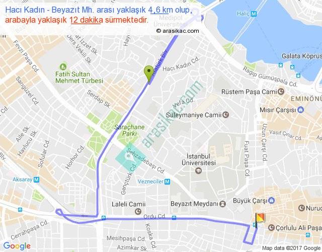 Hacı Kadın - Beyazıt Mh. arası yaklaşık olarak 90 km/h ile yukarıda belirtilen sürede olup, iki yerin kuş uçuşu uzaklığı (mesafesi) 1'dir. Yolculuk otobüsle 15 dakika sürmektedir.
