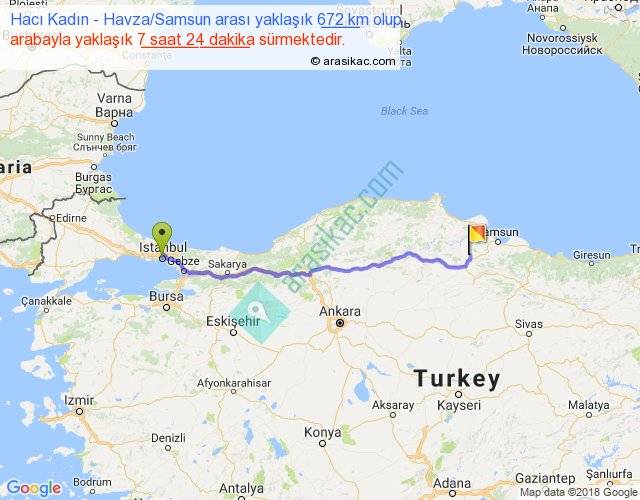 Hacı Kadın - Havza Samsun arası yaklaşık olarak 90 km/h ile yukarıda belirtilen sürede olup, iki yerin kuş uçuşu uzaklığı (mesafesi) 564'dir. Eğer belirtilen yerler arasında uçak seferi var ise bu süre uçakla 52 dakika'ya kadar düşebilir. Yolculuk otobüsle 9 saat 37 dakika sürmektedir.