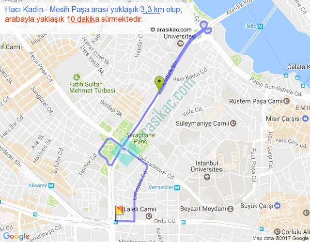 Hacı Kadın - Mesih Paşa arası yaklaşık olarak 90 km/h ile yukarıda belirtilen sürede olup, iki yerin kuş uçuşu uzaklığı (mesafesi) 1'dir. Yolculuk otobüsle 13 dakika sürmektedir.