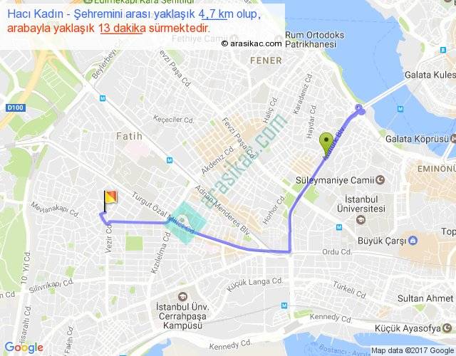 Hacı Kadın - Şehremini arası yaklaşık olarak 90 km/h ile yukarıda belirtilen sürede olup, iki yerin kuş uçuşu uzaklığı (mesafesi) 2'dir. Yolculuk otobüsle 16 dakika sürmektedir.
