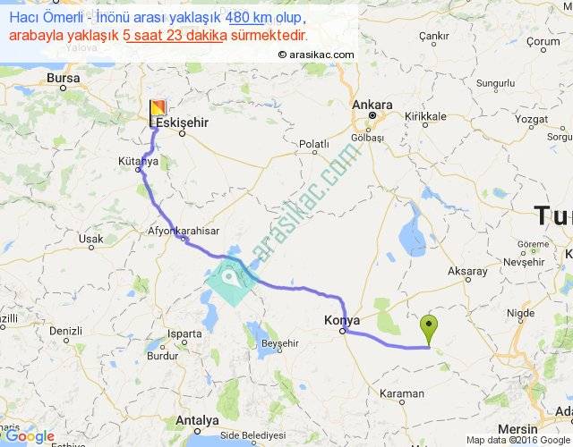 Hacı Ömerli - İnönü arası yaklaşık olarak 90 km/h ile yukarıda belirtilen sürede olup, iki yerin kuş uçuşu uzaklığı (mesafesi) 374'dir. Eğer belirtilen yerler arasında uçak seferi var ise bu süre uçakla 34 dakika'ya kadar düşebilir. Yolculuk otobüsle 6 saat 59 dakika sürmektedir.