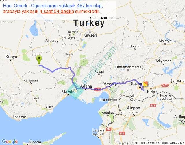 Hacı Ömerli - Oğuzeli arası yaklaşık olarak 90 km/h ile yukarıda belirtilen sürede olup, iki yerin kuş uçuşu uzaklığı (mesafesi) 358'dir. Eğer belirtilen yerler arasında uçak seferi var ise bu süre uçakla 33 dakika'ya kadar düşebilir. Yolculuk otobüsle 6 saat 22 dakika sürmektedir.