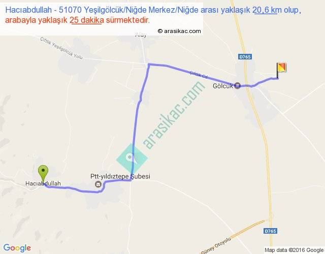 Hacıabdullah - 51070 Yeşilgölcük Niğde Merkez Niğde arası yaklaşık olarak 90 km/h ile yukarıda belirtilen sürede olup, iki yerin kuş uçuşu uzaklığı (mesafesi) 15'dir. Yolculuk otobüsle 32 dakika sürmektedir.