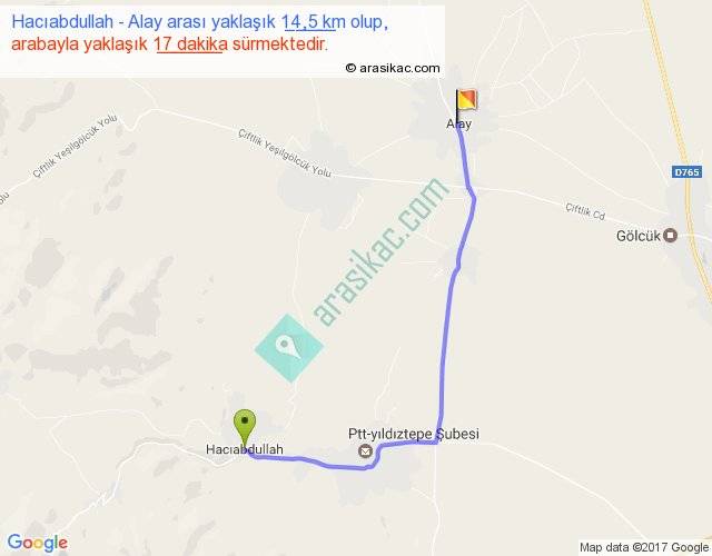 Hacıabdullah - Alay arası yaklaşık olarak 90 km/h ile yukarıda belirtilen sürede olup, iki yerin kuş uçuşu uzaklığı (mesafesi) 10'dir. Yolculuk otobüsle 22 dakika sürmektedir.