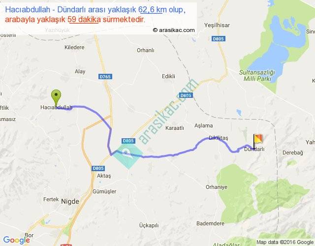 Hacıabdullah - Dündarlı arası yaklaşık olarak 90 km/h ile yukarıda belirtilen sürede olup, iki yerin kuş uçuşu uzaklığı (mesafesi) 49'dir. Yolculuk otobüsle 1 saat 16 dakika sürmektedir.