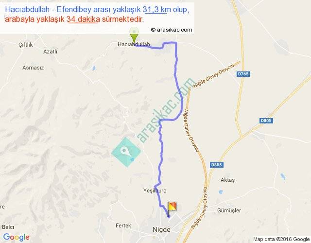 Hacıabdullah - Efendibey arası yaklaşık olarak 90 km/h ile yukarıda belirtilen sürede olup, iki yerin kuş uçuşu uzaklığı (mesafesi) 22'dir. Yolculuk otobüsle 44 dakika sürmektedir.