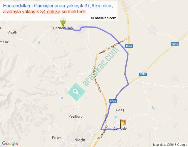 Hacıabdullah - Gümüşler arası yaklaşık olarak 90 km/h ile yukarıda belirtilen sürede olup, iki yerin kuş uçuşu uzaklığı (mesafesi) 24'dir. Yolculuk otobüsle 44 dakika sürmektedir.
