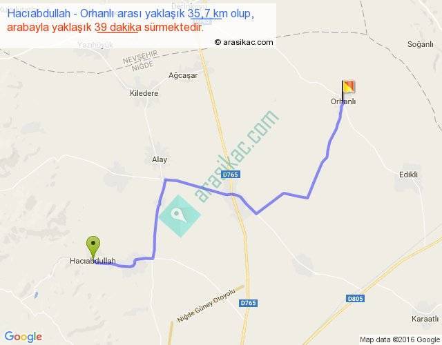 Hacıabdullah - Orhanlı arası yaklaşık olarak 90 km/h ile yukarıda belirtilen sürede olup, iki yerin kuş uçuşu uzaklığı (mesafesi) 26'dir. Yolculuk otobüsle 50 dakika sürmektedir.