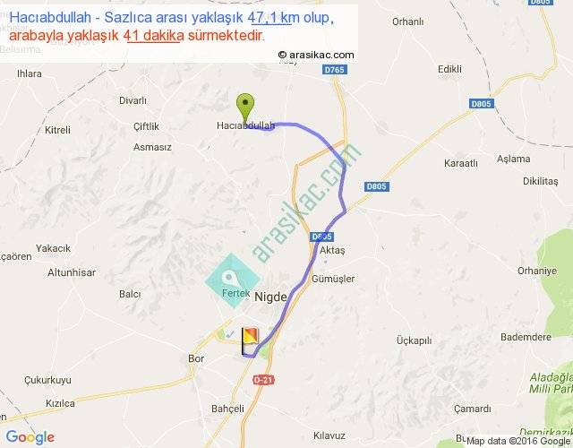 Hacıabdullah - Sazlıca arası yaklaşık olarak 90 km/h ile yukarıda belirtilen sürede olup, iki yerin kuş uçuşu uzaklığı (mesafesi) 31'dir. Yolculuk otobüsle 53 dakika sürmektedir.