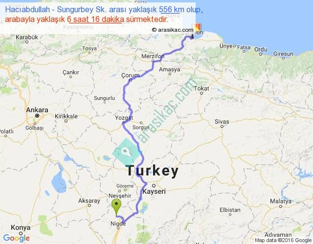 Hacıabdullah - Sungurbey Sk. arası yaklaşık olarak 90 km/h ile yukarıda belirtilen sürede olup, iki yerin kuş uçuşu uzaklığı (mesafesi) 371'dir. Eğer belirtilen yerler arasında uçak seferi var ise bu süre uçakla 34 dakika'ya kadar düşebilir. Yolculuk otobüsle 8 saat 8 dakika sürmektedir.
