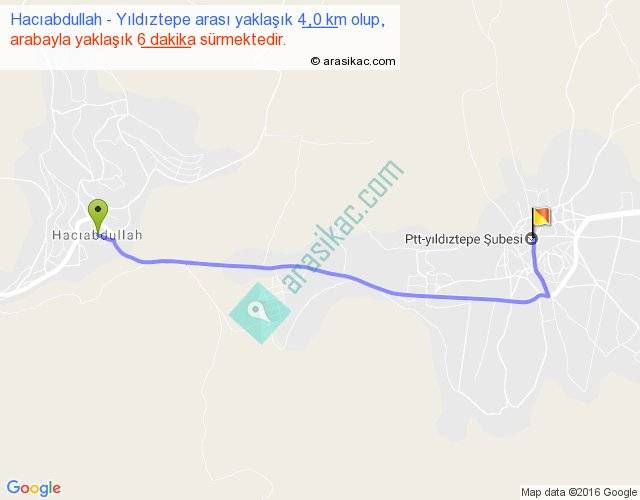 Hacıabdullah - Yıldıztepe arası yaklaşık olarak 90 km/h ile yukarıda belirtilen sürede olup, iki yerin kuş uçuşu uzaklığı (mesafesi) 3'dir. Yolculuk otobüsle 7 dakika sürmektedir.