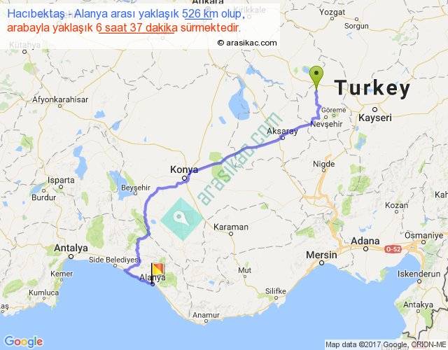Hacıbektaş - Alanya arası yaklaşık olarak 90 km/h ile yukarıda belirtilen sürede olup, iki yerin kuş uçuşu uzaklığı (mesafesi) 347'dir. Eğer belirtilen yerler arasında uçak seferi var ise bu süre uçakla 32 dakika'ya kadar düşebilir. Yolculuk otobüsle 8 saat 36 dakika sürmektedir.