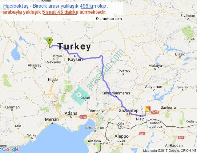 Hacıbektaş - Birecik arası yaklaşık olarak 90 km/h ile yukarıda belirtilen sürede olup, iki yerin kuş uçuşu uzaklığı (mesafesi) 365'dir. Eğer belirtilen yerler arasında uçak seferi var ise bu süre uçakla 33 dakika'ya kadar düşebilir. Yolculuk otobüsle 7 saat 28 dakika sürmektedir.
