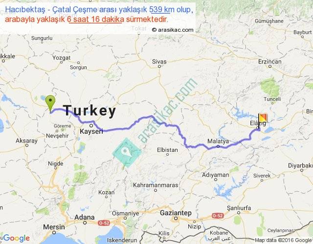 Hacıbektaş - Çatal Çeşme arası yaklaşık olarak 90 km/h ile yukarıda belirtilen sürede olup, iki yerin kuş uçuşu uzaklığı (mesafesi) 406'dir. Eğer belirtilen yerler arasında uçak seferi var ise bu süre uçakla 37 dakika'ya kadar düşebilir. Yolculuk otobüsle 8 saat 8 dakika sürmektedir.