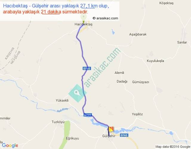 Hacıbektaş - Gülşehir arası yaklaşık olarak 90 km/h ile yukarıda belirtilen sürede olup, iki yerin kuş uçuşu uzaklığı (mesafesi) 23'dir. Yolculuk otobüsle 27 dakika sürmektedir.