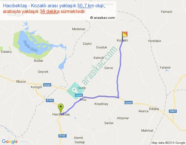 Hacıbektaş - Kozaklı arası yaklaşık olarak 90 km/h ile yukarıda belirtilen sürede olup, iki yerin kuş uçuşu uzaklığı (mesafesi) 39'dir. Yolculuk otobüsle 49 dakika sürmektedir.