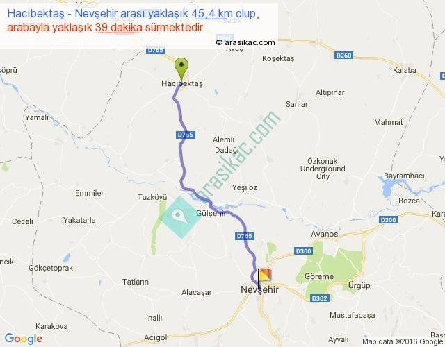 Hacıbektaş - Nevşehir arası yaklaşık olarak 90 km/h ile yukarıda belirtilen sürede olup, iki yerin kuş uçuşu uzaklığı (mesafesi) 38'dir. Yolculuk otobüsle 50 dakika sürmektedir.