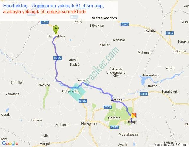 Hacıbektaş - Ürgüp arası yaklaşık olarak 90 km/h ile yukarıda belirtilen sürede olup, iki yerin kuş uçuşu uzaklığı (mesafesi) 46'dir. Yolculuk otobüsle 1 saat 5 dakika sürmektedir.