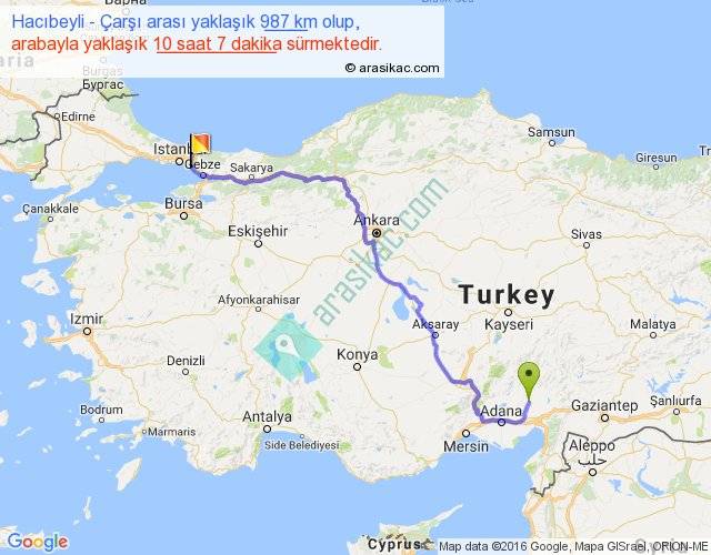 Hacıbeyli - Çarşı arası yaklaşık olarak 90 km/h ile yukarıda belirtilen sürede olup, iki yerin kuş uçuşu uzaklığı (mesafesi) 696'dir. Eğer belirtilen yerler arasında uçak seferi var ise bu süre uçakla 1 saat 04 dakika'ya kadar düşebilir. Yolculuk otobüsle 13 saat 9 dakika sürmektedir.