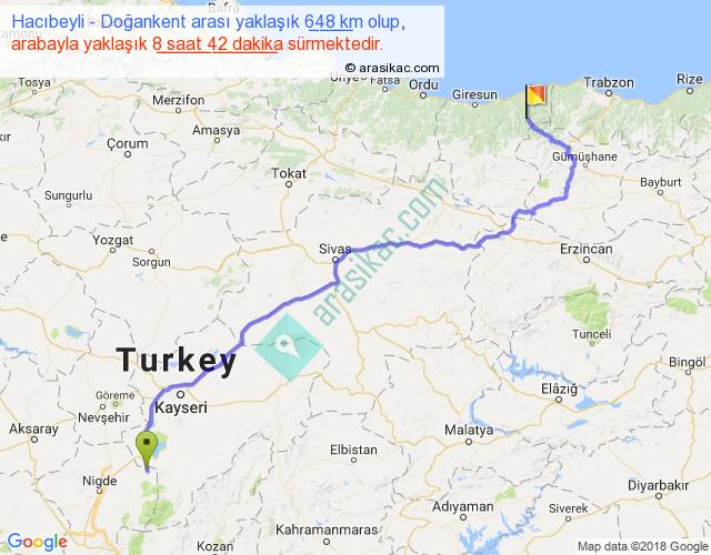 Hacıbeyli - Doğankent arası yaklaşık olarak 90 km/h ile yukarıda belirtilen sürede olup, iki yerin kuş uçuşu uzaklığı (mesafesi) 437'dir. Eğer belirtilen yerler arasında uçak seferi var ise bu süre uçakla 40 dakika'ya kadar düşebilir. Yolculuk otobüsle 11 saat 18 dakika sürmektedir.