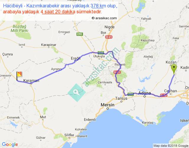 Hacıbeyli - Kazımkarabekir arası yaklaşık olarak 90 km/h ile yukarıda belirtilen sürede olup, iki yerin kuş uçuşu uzaklığı (mesafesi) 257'dir. Eğer belirtilen yerler arasında uçak seferi var ise bu süre uçakla 23 dakika'ya kadar düşebilir. Yolculuk otobüsle 5 saat 38 dakika sürmektedir.