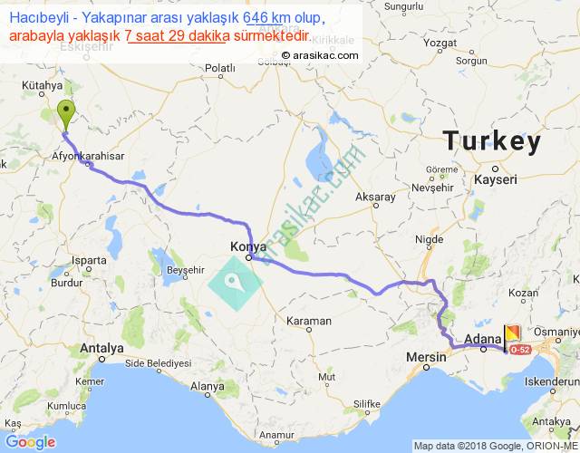 Hacıbeyli - Yakapınar arası yaklaşık olarak 90 km/h ile yukarıda belirtilen sürede olup, iki yerin kuş uçuşu uzaklığı (mesafesi) 519'dir. Eğer belirtilen yerler arasında uçak seferi var ise bu süre uçakla 47 dakika'ya kadar düşebilir. Yolculuk otobüsle 9 saat 43 dakika sürmektedir.