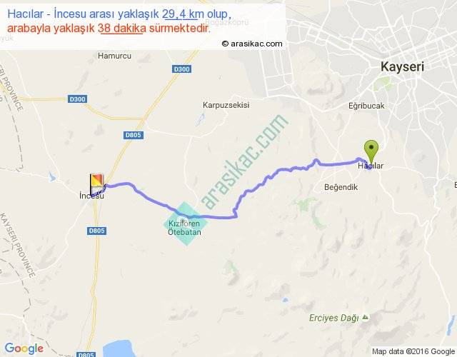 Hacılar - İncesu arası yaklaşık olarak 90 km/h ile yukarıda belirtilen sürede olup, iki yerin kuş uçuşu uzaklığı (mesafesi) 23'dir. Yolculuk otobüsle 49 dakika sürmektedir.