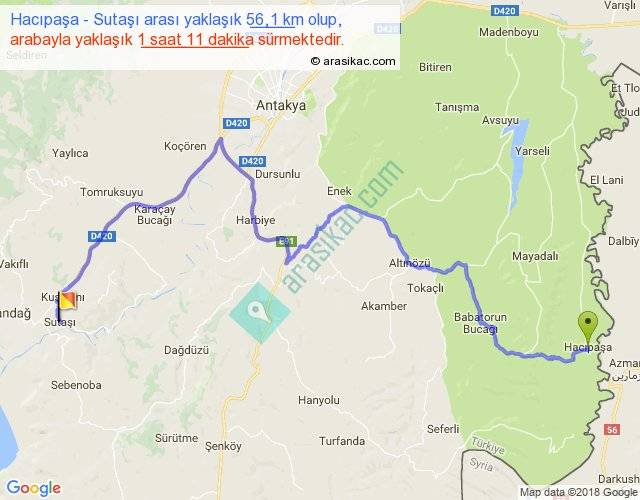 Hacıpaşa - Sutaşı arası yaklaşık olarak 90 km/h ile yukarıda belirtilen sürede olup, iki yerin kuş uçuşu uzaklığı (mesafesi) 32'dir. Yolculuk otobüsle 1 saat 32 dakika sürmektedir.