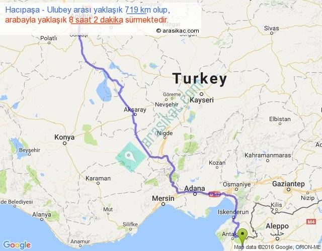 Hacıpaşa - Ulubey arası yaklaşık olarak 90 km/h ile yukarıda belirtilen sürede olup, iki yerin kuş uçuşu uzaklığı (mesafesi) 526'dir. Eğer belirtilen yerler arasında uçak seferi var ise bu süre uçakla 48 dakika'ya kadar düşebilir. Yolculuk otobüsle 10 saat 26 dakika sürmektedir.