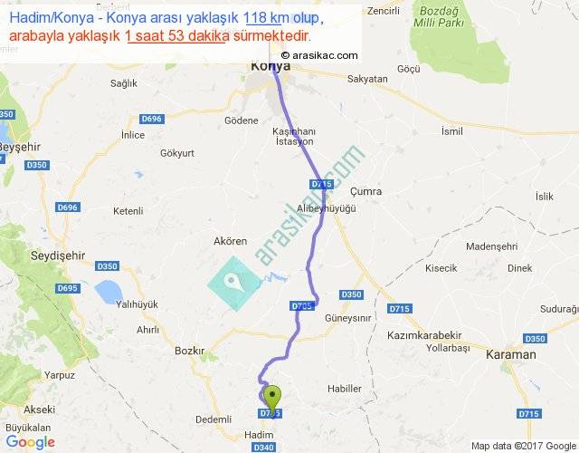 Hadim Konya - Konya arası yaklaşık olarak 90 km/h ile yukarıda belirtilen sürede olup, iki yerin kuş uçuşu uzaklığı (mesafesi) 94'dir. Yolculuk otobüsle 2 saat 26 dakika sürmektedir.