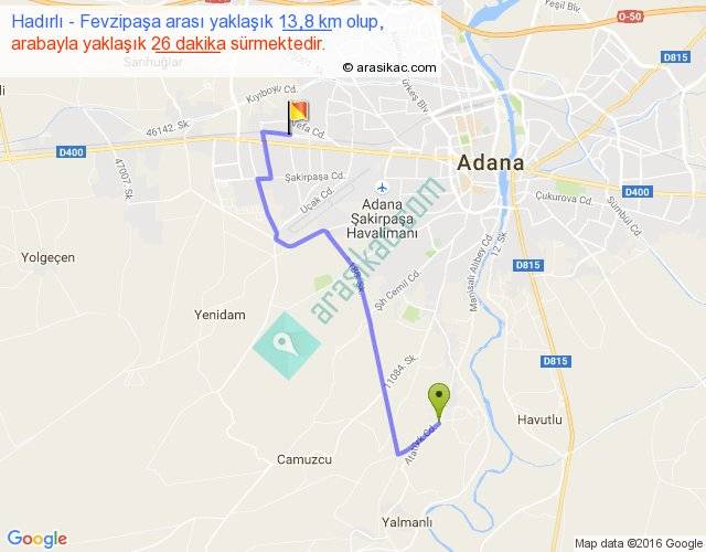 Hadırlı - Fevzipaşa arası yaklaşık olarak 90 km/h ile yukarıda belirtilen sürede olup, iki yerin kuş uçuşu uzaklığı (mesafesi) 9'dir. Yolculuk otobüsle 33 dakika sürmektedir.