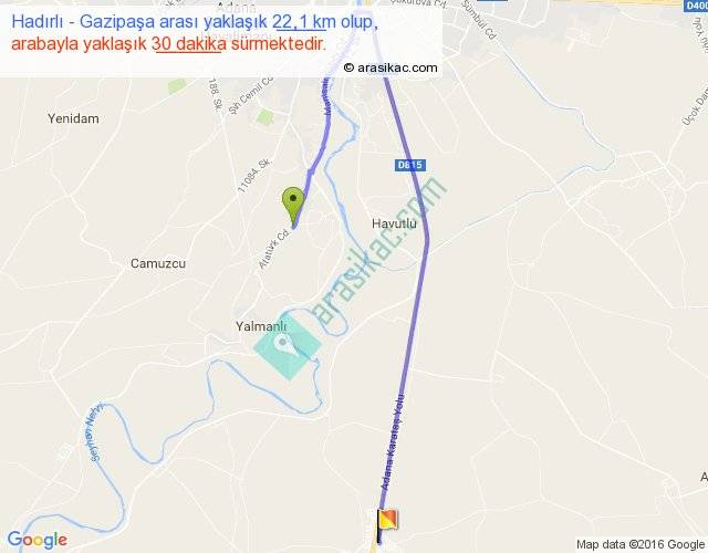 Hadırlı - Gazipaşa arası yaklaşık olarak 90 km/h ile yukarıda belirtilen sürede olup, iki yerin kuş uçuşu uzaklığı (mesafesi) 9'dir. Yolculuk otobüsle 39 dakika sürmektedir.