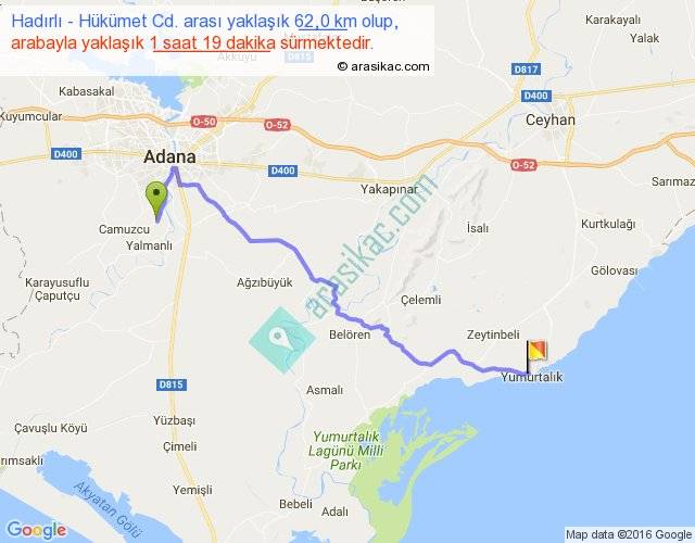 Hadırlı - Hükümet Cd. arası yaklaşık olarak 90 km/h ile yukarıda belirtilen sürede olup, iki yerin kuş uçuşu uzaklığı (mesafesi) 45'dir. Yolculuk otobüsle 1 saat 42 dakika sürmektedir.