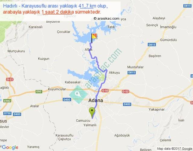 Hadırlı - Karayusuflu arası yaklaşık olarak 90 km/h ile yukarıda belirtilen sürede olup, iki yerin kuş uçuşu uzaklığı (mesafesi) 30'dir. Yolculuk otobüsle 1 saat 20 dakika sürmektedir.