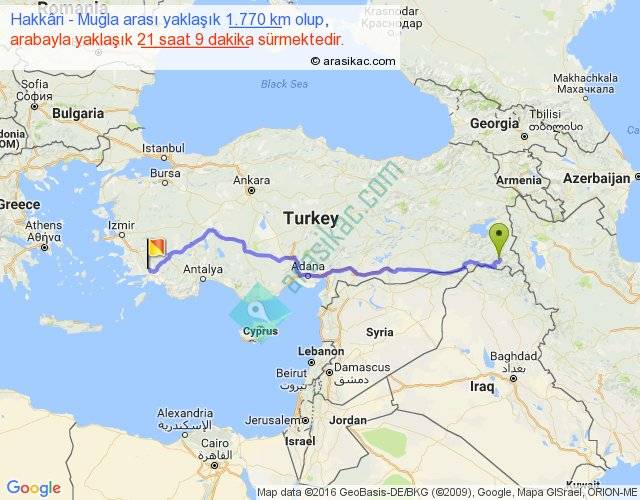 Hakkâri - Muğla arası yaklaşık olarak 90 km/h ile yukarıda belirtilen sürede olup, iki yerin kuş uçuşu uzaklığı (mesafesi) 1349'dir. Eğer belirtilen yerler arasında uçak seferi var ise bu süre uçakla 2 saat 04 dakika'ya kadar düşebilir. Yolculuk otobüsle 1 gün 3 saat sürmektedir.