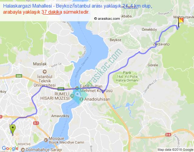 Halaskargazi Mahallesi - Beykoz İstanbul arası yaklaşık olarak 90 km/h ile yukarıda belirtilen sürede olup, iki yerin kuş uçuşu uzaklığı (mesafesi) 19'dir. Yolculuk otobüsle 48 dakika sürmektedir.