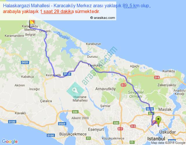 Halaskargazi Mahallesi - Karacaköy Merkez arası yaklaşık olarak 90 km/h ile yukarıda belirtilen sürede olup, iki yerin kuş uçuşu uzaklığı (mesafesi) 64'dir. Yolculuk otobüsle 1 saat 54 dakika sürmektedir.