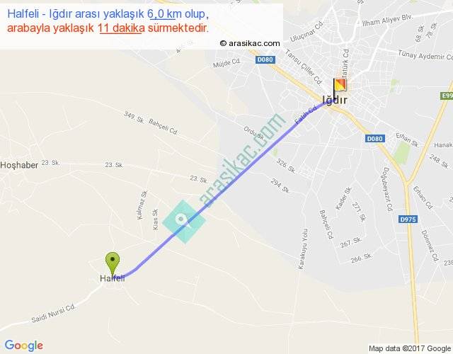 Halfeli - Iğdır arası yaklaşık olarak 90 km/h ile yukarıda belirtilen sürede olup, iki yerin kuş uçuşu uzaklığı (mesafesi) 6'dir. Yolculuk otobüsle 14 dakika sürmektedir.